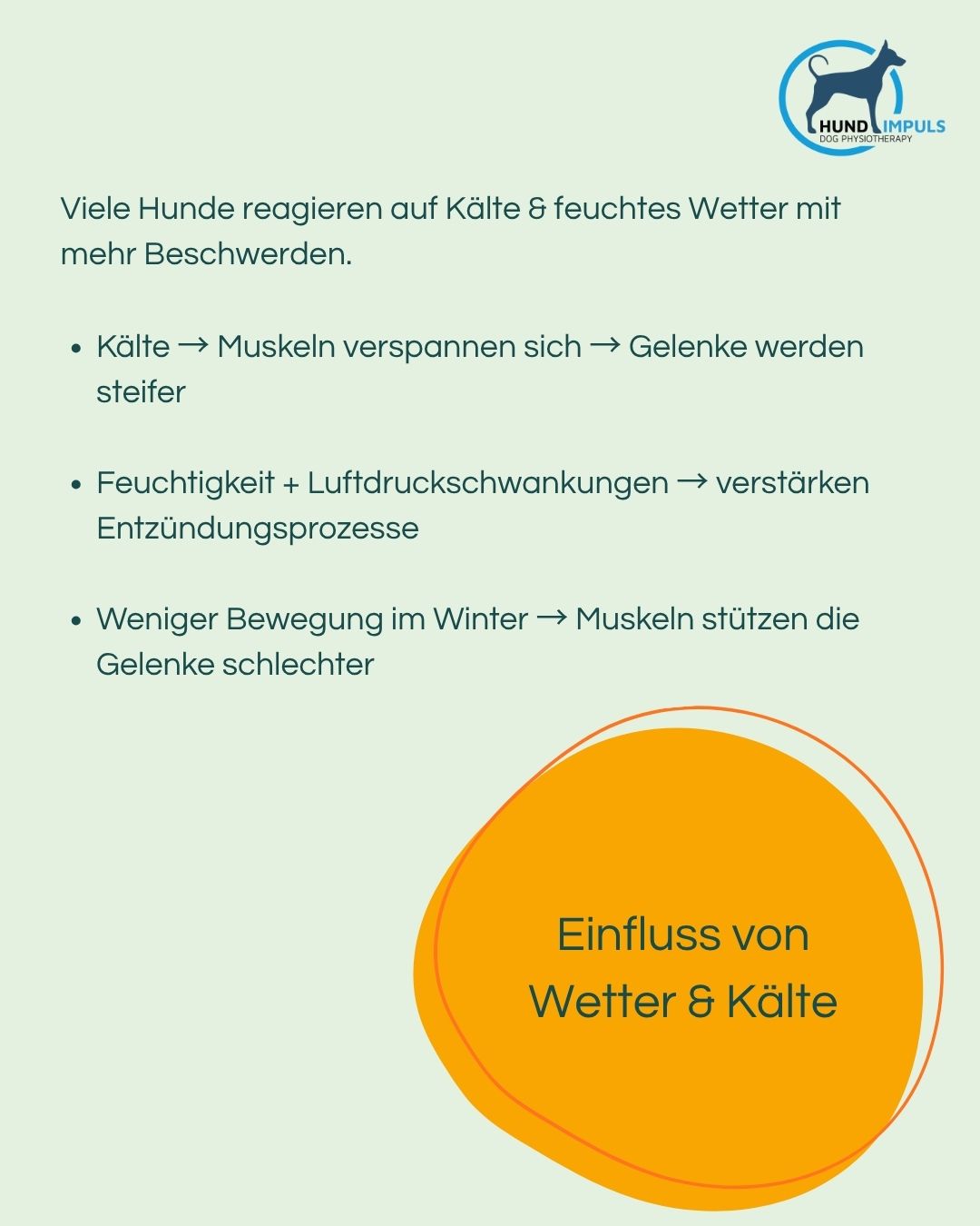 Bei sinkenden Temperaturen bewegen sich Hund oft weniger. Die Folge: Gelenke werden schlechter mit Nährstoffen versorgt, was Entzündungen begünstigt. Auch das Immunsystem arbeitet im Winter oft weniger effizient, was Entzündungen und Schmerzen begünstigt.