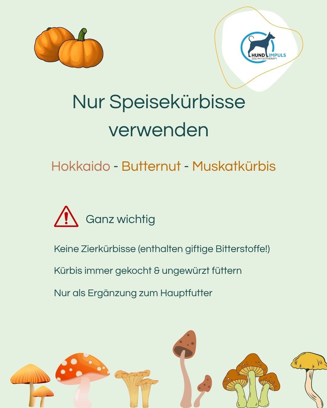 Verwende ausschließlich Speisekürbisse wie Hokkaido, Butternut oder Muskatkürbis. Diese Sorten sind frei von Bitterstoffen und gut bekömmlich.