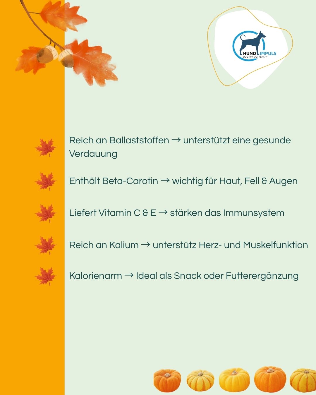 Kürbis ist ein wahres Multitalent in der natürlichen Hundeernährung. Er unterstütz Verdauung, Immunsystem und Muskelfunktion, versorgt deinen Hund mit wichtigen Vitaminen und ist dabei kalorienarm.